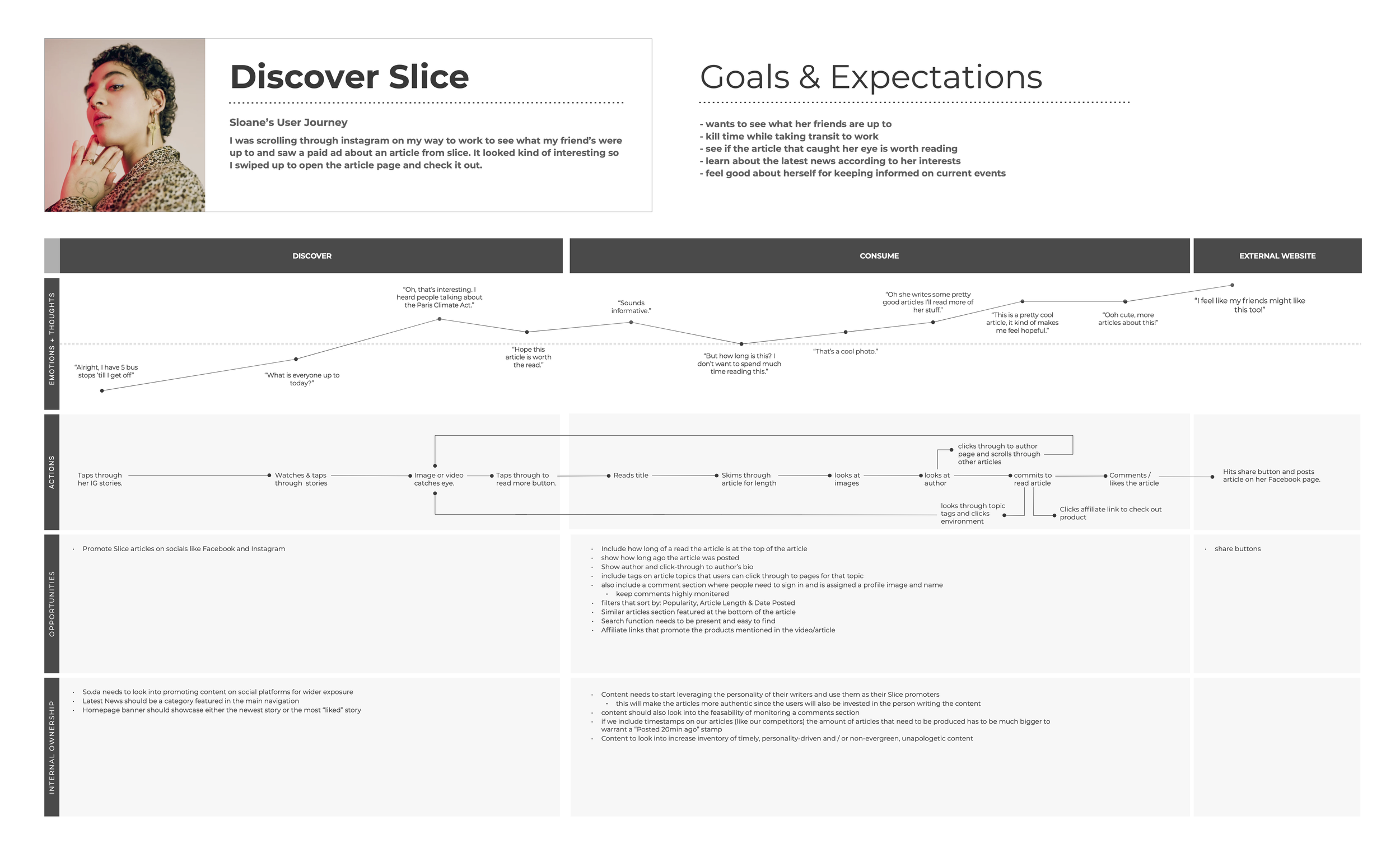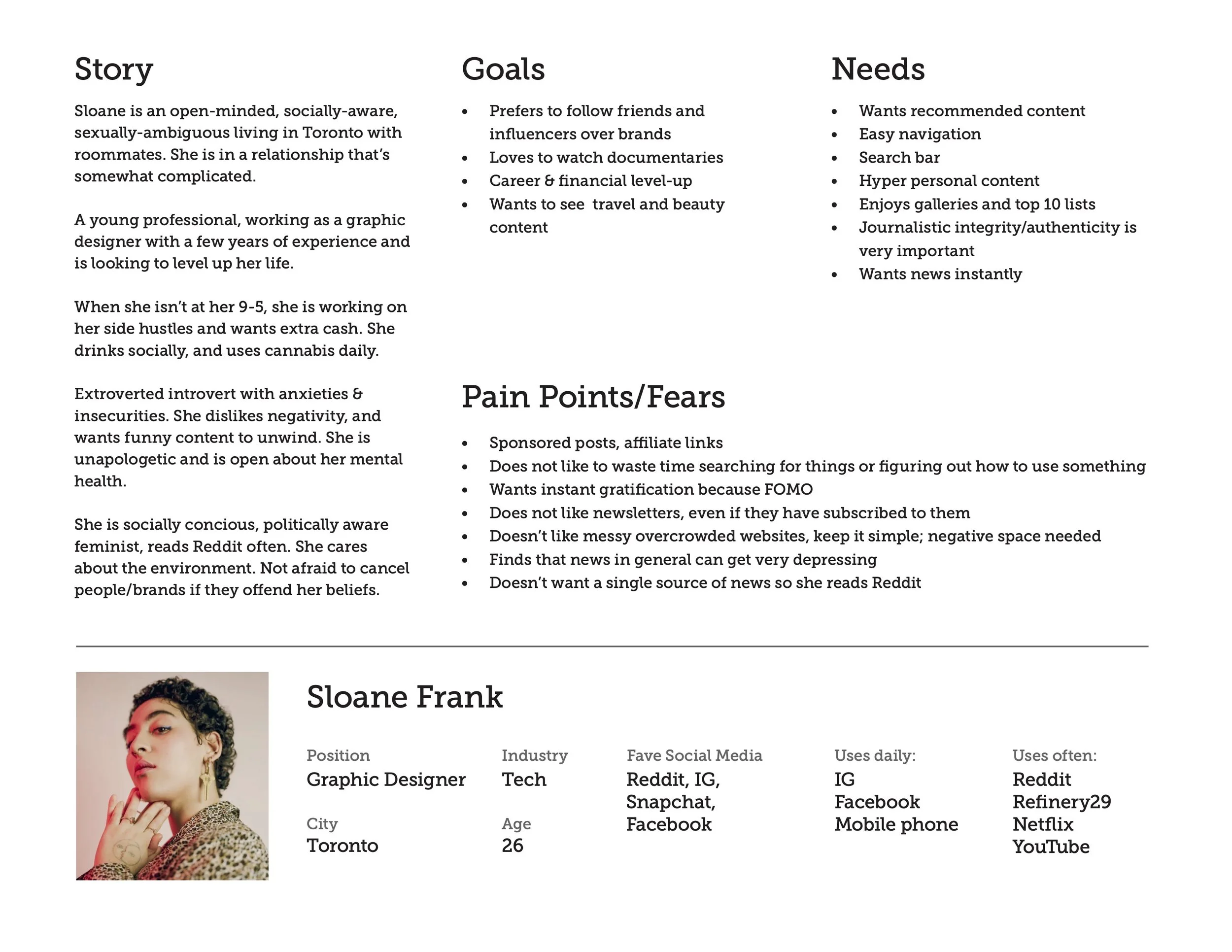 The project began with a cross-department kickoff workshop to align stakeholders on the goals of the redesign and establish a shared vision for the new platform. One of the most significant strategic shifts that emerged from this conversation was the need to attract a younger audience without losing the brand’s existing voice. To better understand this target demographic, I conducted interviews with users who frequently consumed editorial content from competing lifestyle brands and digital publishers. These conversations focused on how users discovered articles, what kept them reading, and what caused them to abandon content. Through this research, a clear pattern emerged. Gen Z readers were far more likely to engage with content that was designed for mobile-first reading, delivered timely and culturally relevant topics, and came from voices they perceived as authentic and trustworthy. These insights informed the development of a primary persona, Sloan, along with a detailed user journey that mapped how younger readers moved from discovering an article to continuing deeper into the site.
