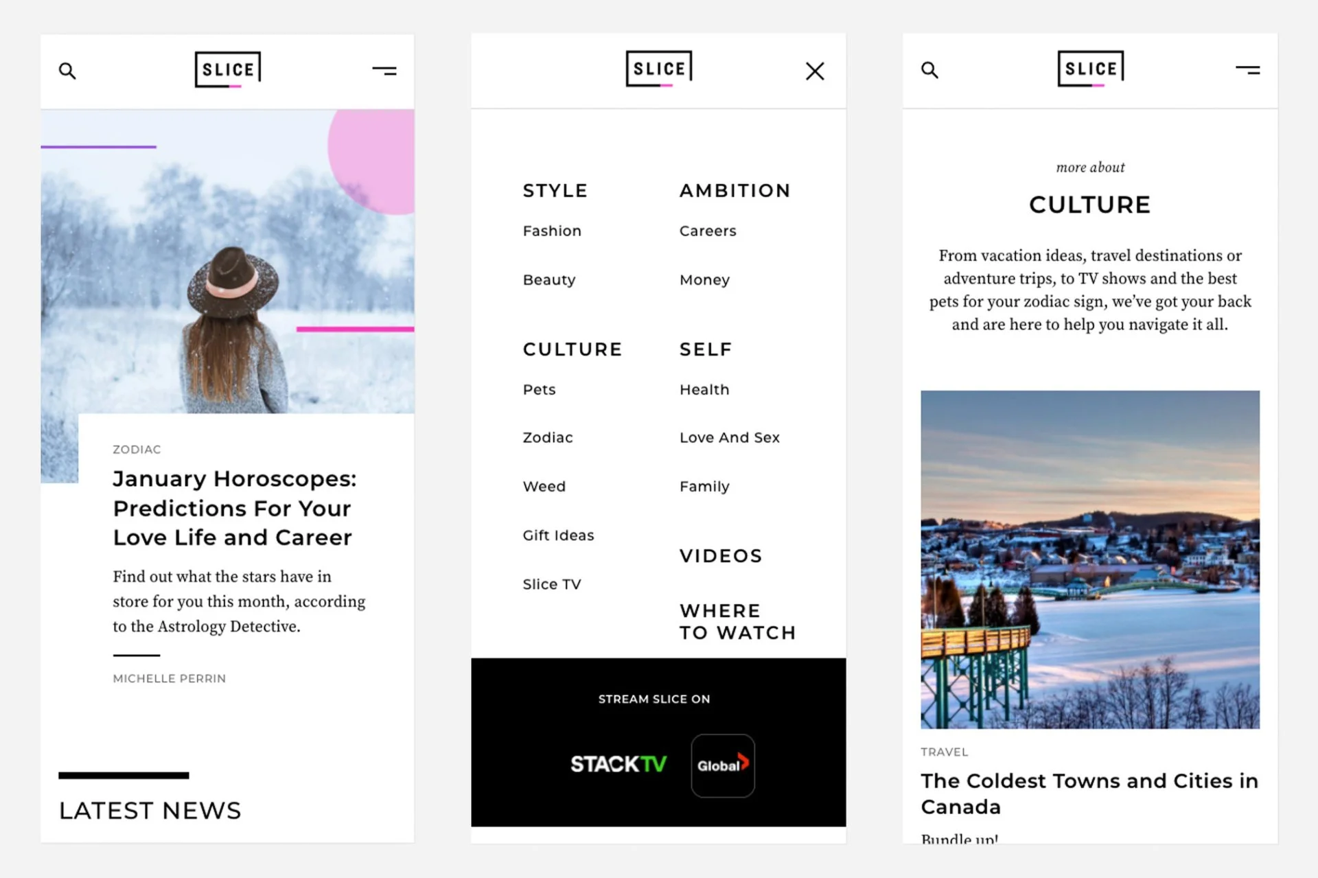 Slice was the first lifestyle brand I led through platform migration while working at Corus Entertainment. The project involved moving the website from .NET to WordPress while redefining the product’s role in a rapidly shifting media landscape. At the time, video content from the network was being pulled from the website, which meant Slice needed to rely more heavily on editorial content to drive engagement. This required rethinking how articles were discovered and consumed — particularly by a younger audience.